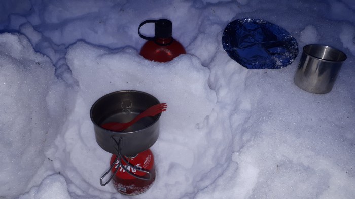 În timpul iernii, pe munte fiind, se întâmplă adesea să nu mai poți găși izvoarele de unde ai fi luat apă în mod normal – și asta din cauza faptului că se poate întâmpla să fie acoperite de zăpadă sau chiar înghețate, dacă frigul este extrem. Sau se poate întâmpla, așa cum este și cazul meu, să gândești unele ieșiri în natură prin niște locuri unde știi din capul locului că nu există surse de apă, bazându-te, deci, pe ideea că ai o grămadă de zăpadă la botu’ calului, care poate fi topită după bunul plac. Am făcut asta de mai multe ori și probabil că o voi mai face și pe viitor. Pentru că, așa cum spuneam, uneori chiar n-ai de ales, iar hidratarea este foarte importantă si în anotimpul rece, chiar dacă nevoia de a bea apă nu va fi la fel de acută ca atunci când e foarte cald, când transpiram serios din cauza căldurii și efortului.