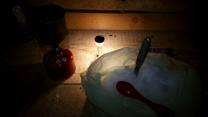 Trebuie menționat aici faptul că pentru a obține 1L de apă, să spunem, este necesară topirea unei cantități destul de serioase de zăpadă. Dar depinde mult și de natura zăpezii. Ca regulă, cu cât această este mai afânată (proaspătă), mai puțin densă, cu atâta va fi nevoie de-un volum mai mare de zăpadă pentru a obține o cantitate rezonabilă de apă. Dacă ai o pungă, cel mai simplu este colectezi zăpadă suficientă în acea pungă, iar apoi, odată aprins arzătorul cu recipientul deasupra, să adaugi (cu lingura, să spunem) puțin câte puțin, pe măsură ce zăpada de topește. Dacă ar fi să încerc o estimare, aș spune că dintr-o pungă de 5L cu zăpadă mai aerată vei obține undeva la cel mult 0.5L de apă.