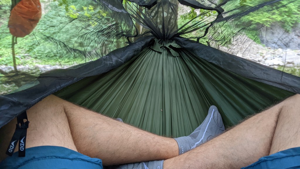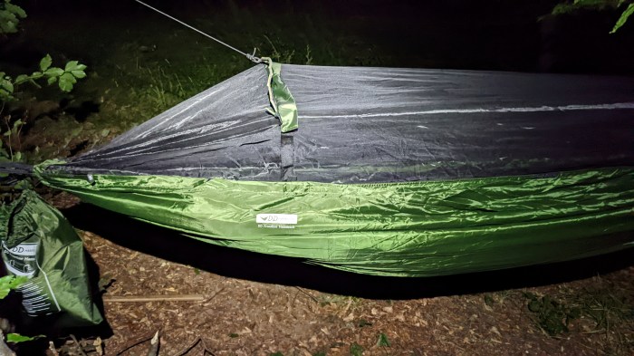 Bun, am zis că o să scriu câteva cuvinte despre hamacul pe care-l utilizez acum, DD Frontline, de vreme ce n-a trecut așa de mult de când m-am bucurat de el. Acesta este cel de-al 3-lea hamac cu plasă în care am dormit până în clipa de față. Înainte de DD am avut un hamac chinezesc, destul de ușor, într-un singur strat (altfel spus, fără teacă pentru saltea), destul de scurt, dar suficient de bun având în vedere prețul foarte scăzut. Apoi, pentru că am simtit nevoia de un upgrade, am trecut la un Amazonas Mosquito Traveler Thermo, hamac german, dotat cu teacă pentru saltea (adică strat dublu), de calitate net superioară celui chinezesc, dar cu care nu m-am prea împăcat dată fiind croiala sa asimetrică – acesta era conceput pentru a dormi pe diagonală, cu hamacul mai puțin întins, tip banană. Ca o paranteză, există două feluri de oameni în lumea hamacelor: cei care preferă să stea cu el destul de întins și cei care preferă să-l atârne mai lăsat, în ideea că astfel vei putea să stai cu adevărat drept, dacă stai, cumva, pe diagonală. Cum prefer să stau cu hamacul suficient de întins, m-am debarasat și de acesta și așa am ajuns la DD Frotline, model pe care-l știam de la un prieten, care-i hamacul care mă gândesc că o să imbatraneasca la mine, pentru că are aproape tot ce-mi doream de la un hamac serios cu plasă.