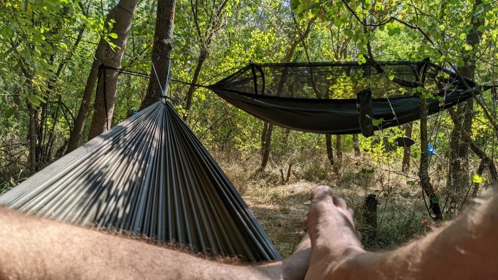 Dacă e să mă compar cu alții, n-aș putea spune că sunt chiar un împătimit al dormitului la hamac. Prefer să dorm la cort dacă am ocazia, dar uneori trebuie să recunosc că mă lovește și cheful de a petrece noaptea la hamac atunci când ies în natură. Avantajul care-mi vine numaidecât în minte este acela că ai ocazia să vezi bine în jurul tău. Unii nu se pot odihni bine la cort tocmai din considerentul ăsta – nu văd în jur (dacă se întâmplă să audă vreun zgomot, să zicem). Dar alteori chiar nu-i despre preferințe, ci zona poate face ca hamacul să fie singura soluție viabilă. De exemplu, dacă ești într-o zonă care-I foarte împădurită și terenul este serios denivelat, hamacul este mijlocul ideal de a petrece noaptea în acea zonă. Alegi doi copaci aflați la distanța potrivită și întinzi hamacul. Nimic mai simplu.