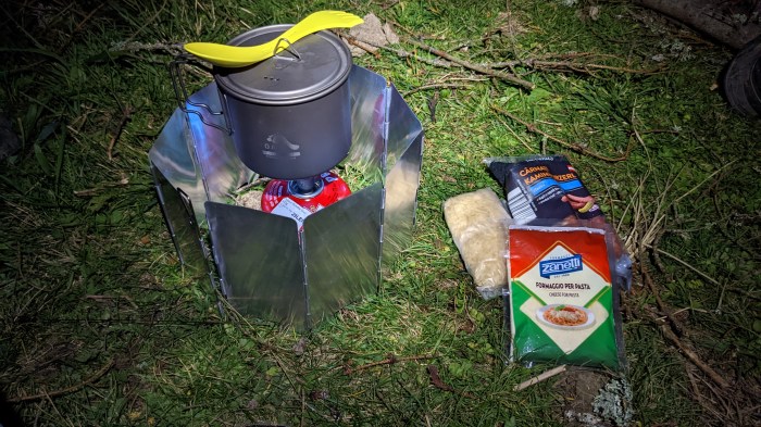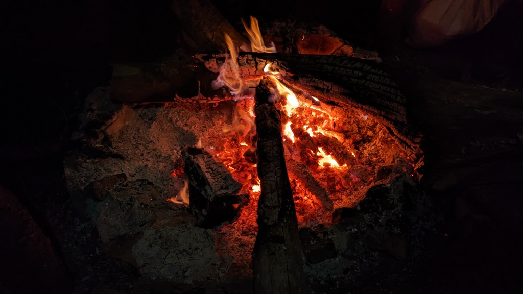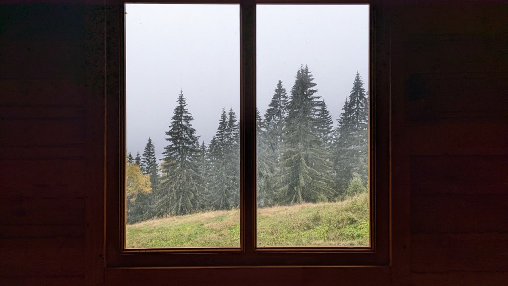 Deși se făcuse târziu, decidem să profităm de vatra de lângă și facem un binemeritat foc, mai ales că temperatura începuse să scadă simțitor și chiar ajungem învăluiți în ceață, la un moment dat. Pentru că foamea își spunea și ea cuvântul, ne punem și să gătim câte ceva. În cazul meu, niște orez cu parmezan și cu cârnăciori. Și uite așa, cu transfoarmarea celor câteva lemne disponibile în cărbuni se încheie o nouă zi, cu doi oameni recunoscători pentru acest refugiu după o zi greuță și pentru inspirația de a fi consultat și harta din satelit, pe care chiar dacă nu se vedea nimic, scria că ar fi un refugiu. Întins pe saltea fiind, îmi pun căștile și pornesc un nou episod din Curb your enthusiasm, seria lui Larry David, coproducator Seinfeld, de care nu sunt chiar așa de…entuziasmat, cel puțin deocamdată, la primele episoade fiind. Om vedea mai încolo daca ma prinde.