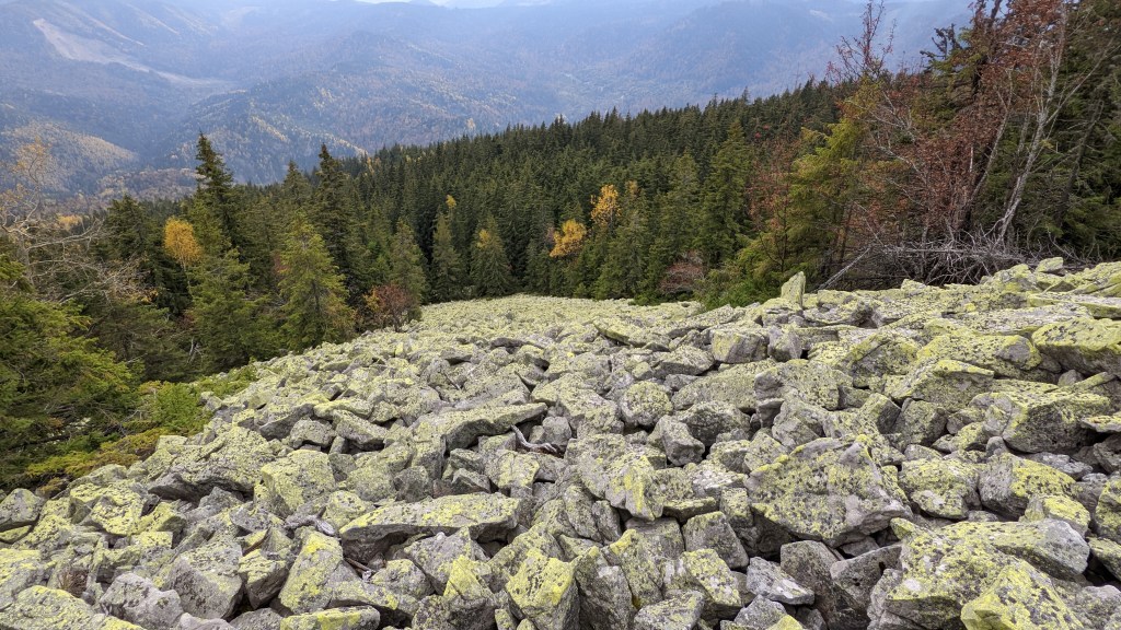 De aici intrăm în pădure și în continuare urmează niște zone mai mult sau mai puțin interesante. Cu adevărat interesant, dar abia după un urcuș deloc ușor, este în zona vârfului Bulboace, dacă chiar acela este vârful, unde tronează o groază de lespezi. Acolo se deschide o vedere și spre masivul Coza, de unde veneam, dar și spre multe alte zone, ale căror verzi întinderi țin cât vezi cu ochii. Fiind așa de fain și cam fiind și ora mesei, ne-am hotărât că acolo să punem arzatoarele la treaba și să ne facem repede ceva de mâncare, pentru a ne asigura că ajungem măcar la 2000kcal/zi. Să tot iei masa în astfel de zone.