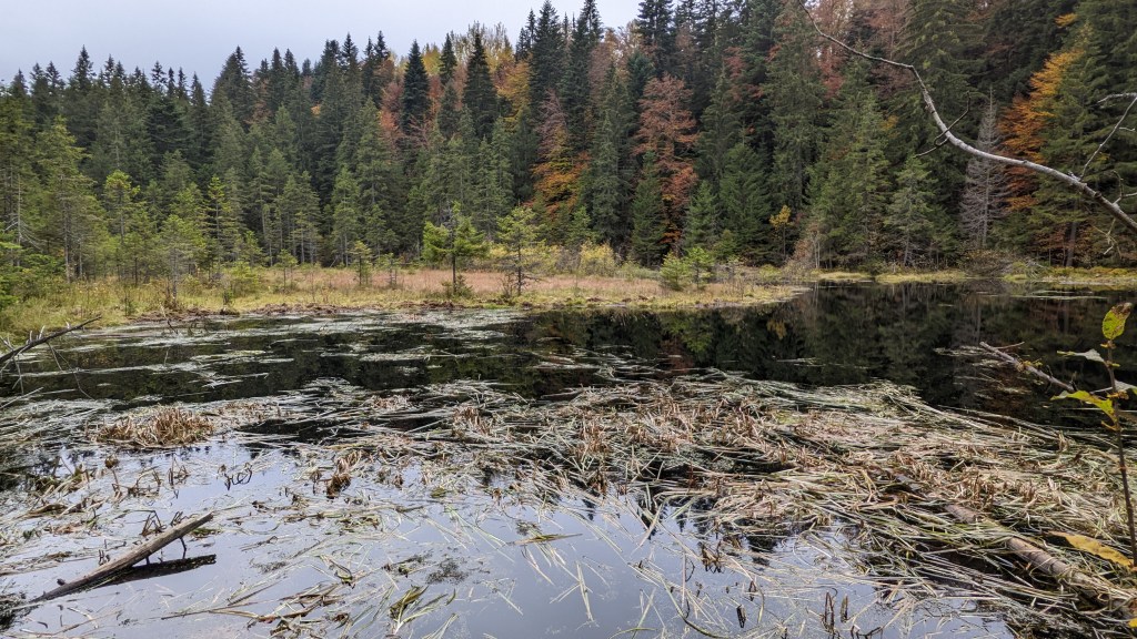 De la Bulboace încolo e o zonă tare faină, super sălbatică, unde n-ai mai deloc vizibilitate și unde nu strică deloc să-ți faci simțită prezența pentru a evita să dai nas în nas cu vreun urs. Apoi urmează o coborâre unde ne interesectăm cu un forestier. Decidem să nu ținem forestierul, ci să urmăm marcajul, care duce într-o zonă unde s-au tăiat o groază de copaci și, nu după mult timp, ajungem și la o intersecție cu marcaje turistice care duce la cantonul de care știam și de unde plănuiam să luăm apă. După o scurtă inspectare, deși întunericul începea să dea târcoale locului, ne hotărâm să ne încercăm norocul un pic mai sus, la aproximativ 1km, unde pe harta din satelit scrie, surpriză, “refugiu Salvamont”, dar nu înainte ca Andu să tragă și o baie în toată regula. Ajunși acolo constatăm că nu este deloc o greșeală, ci că acolo chiar s-a construit un refugiu nu cu foarte mult timp în urmă. Data trecută trecusem fix pe acolo și nu exista nimic. Dacă am fi ținut forestierul amintit, am fi trecut fix pe lângă el. Acesta se numește refugiul Lacul Negru, de la numele lacului aflat la 20 de minute de mers, traseu marcat cu cruce albastră.