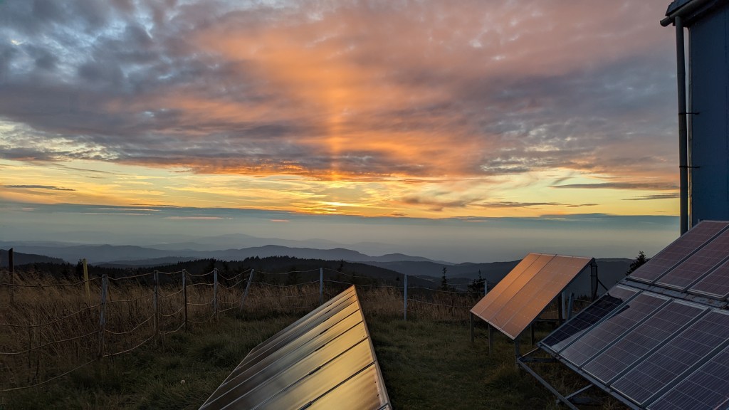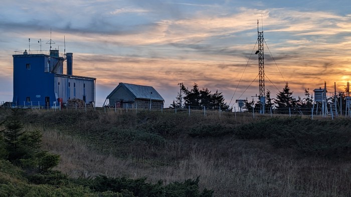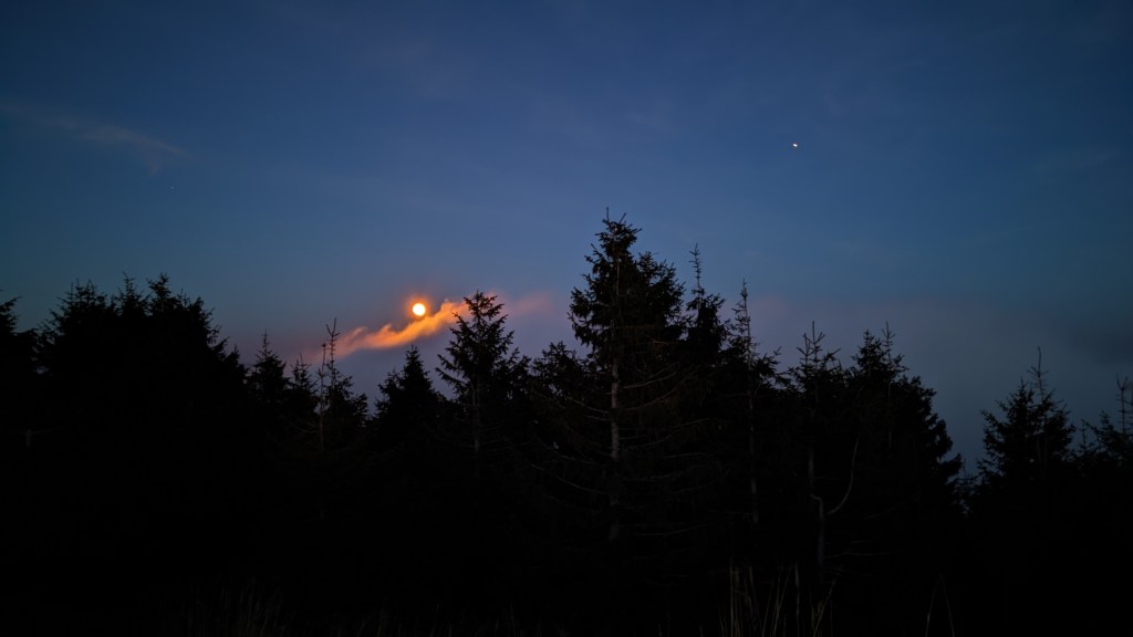 Și iată că se arată și stația meteo într-un final, stație pe lângă care mai trecusem și cu alte ocazii, dar care rămăsese ascusă privirii. Aici ni se spune că izvorul este undeva pe traseul de unde am venit, așa că o luăm din nou în direcția aia, la lumina lanternelor, doar cu recipientele pentru apă de data asta. La întoarcere, sus, ne primim și răsplata efortului în formă unui apus și, la scurt timp după, pe cealaltă parte, către nord-est, a unui răsărit de luna cât se poate de spectaculos. Și iată și refugiul Lacauti unde, după ce ne așezăm noi care cum are chef, decidem ca n-ar fi rău deloc să facem din nou un foc în vatra disponibilă, pentru a termina cum se cuvine și această zi.