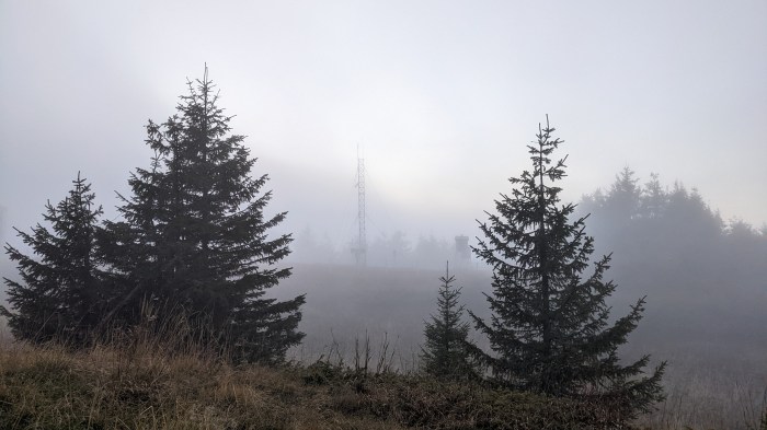 Din punctul ăsta nu am mai putut merge fix pe traseu, pentru că marcajele lipseau cu desăvârșire, dar am mers pe GPS, unde se vedea clar că tot ce aveam de făcut era să ocolim vârful Mîrdanu pe curbă de nivel, în sensul acelor de ceasornic. Fără ajutorul GPS-ului clar ar fi fost ceva mai greu să ne descurcăm în zona asta, mai ales că nici nu prea mai aveam multă lumina la dispoziție. Într-un final găsim și poteca și marcajul și, după ce o luăm din nou greșit (din cauza unei săgeți aflate pe un copac de data asta), ajungem “back on track”, cum se spune, și pădurea înalta lasă în cele din urmă loc unei zone de jnepeniș printre care se găsesc o groază merișoare pe tot ce mai înseamnă urcarea către stație. Deși e târziu și destul de frig pentru cum eram îmbrăcăți (erau undeva la 2C, iar noi eram la mânecă scurtă), ne oprim să băgăm în noi merișoare cât cuprinde și ne hotărâm să o luăm din nou din loc abia când începem să tremuram de-a binelea.