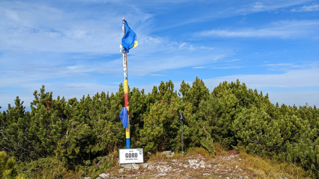 Într-un final, găsim izvorul aflat fix la urcare spre vârf și ne bucurăm că am scăpat de forestierul ale carui noroaie ne deadea bătăi de cap și acum avem doar jnepeni și…merișoare, merișoare de care Andu profită la maxim, mărturisindu-mi pe vârf că el crede că a mâncat undeva la juma’ de kil pe acea urcare, pentru că-l tot vedeam rămânând în urmă și aplecat peste tufe. În sfârșit, vârful, unde există un stâlp indicator căzut pe jos și un steag.