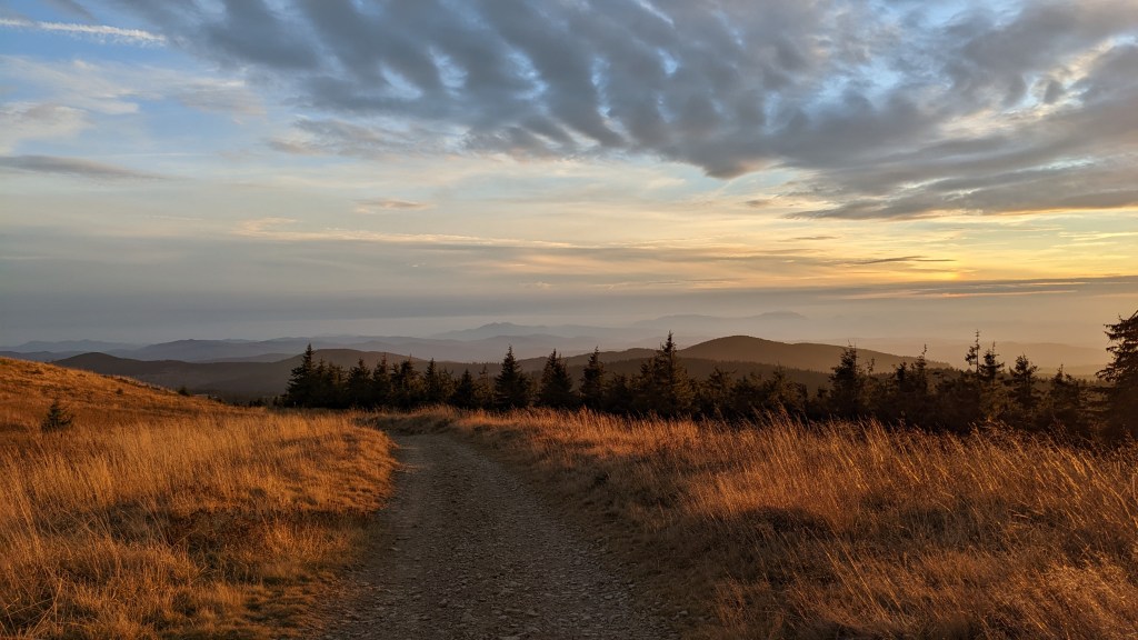 De aici avem și șansa de a arunca o privire spre locurile de unde veneam, adică spre masivul Coza, cât și către sud-est, spre culmile care duc către vârful Giurgiu, pe care-l luasem în calcul fix pentru tura asta, plan pe care am zis să-l lăsăm pentru altădată, când vom avea mai mult timp de balaurit și poate mai puțină oboseală acumulată. Tot de aici putem vedea și culmile pe unde merge traseul bandă roșie amintit deja, pe care mersesem cu Georgiana în 2016, traseu ce duce în direcția vârfului Pietrosul. La întoarcere, traseul ni s-a părut mai ușor și am ajuns la fix la Lăcăuți, când din nou urma să apună soarele, pentru a ne oferi un ultim spectacol. Pentru că atmosfera era cum nu se poate mai limpede, înainte de a ajunge la stația meteo am putut vedea, în ordine de la stânga la dreapta, următoarele: Penteleul, apoi Siriul, culmea Gropșoarele, Ciucașul, Piatra Mare și Postavaru și chiar și Bucegii. Ajunși din nou la refugiu, am pus-o din nou de gătit, de-un foc afară, la lumina lunii, după care ne-am retras către sacii de dormit pentru un somn odihnitor, eu pe podea și Andu pe priciul de jos, invers decât am procedat la refugiul lacul Negru.