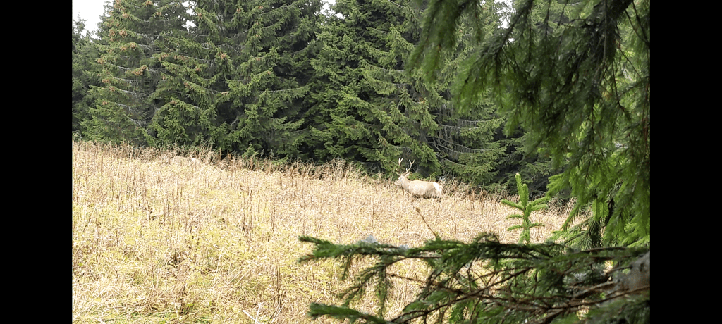 După fix 50 de minute eu eram ferm convins că nu o să vedem nimic și că ar cam fi cazul s-o luăm din loc după ce se scurge fix o oră, pentru a ne asigura că ajungem în Comandau în timp util. Andu nu și nu, că sigur o să vedem ceva. De unde era el așa sigur, nu știu. Optimist incurabil. Și, surpriză, chiar vedem, dar mai întâi auzim și apoi vedem; cu coadă ochiului zărim o ciuta ce se oprește fix la intrarea în poiană, scrutând-o bine pentru a se asigura că-i un loc cât se poate de singur pentru ea și familia ei. Apoi începe să pașească încet, aproape fără zgomot, urmată fiind de-o ciuta mai mică, apoi de încă una mare, apoi, spre final, surpriză, un superb exemplar de cerb, cu niște coarne imense, e acolo să închidă coloana. Nu ne vine să credem și chicotim plini de entuziasm, spunându-ne că a meritat pe deplin așteptarea.